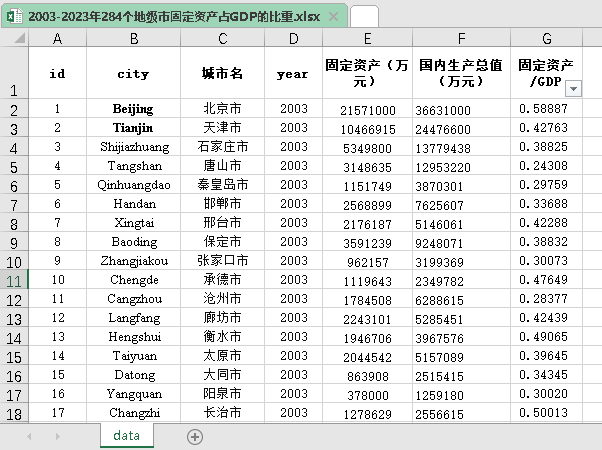 2003-2023年284个地级市固定资产占GDP的比重.xlsx