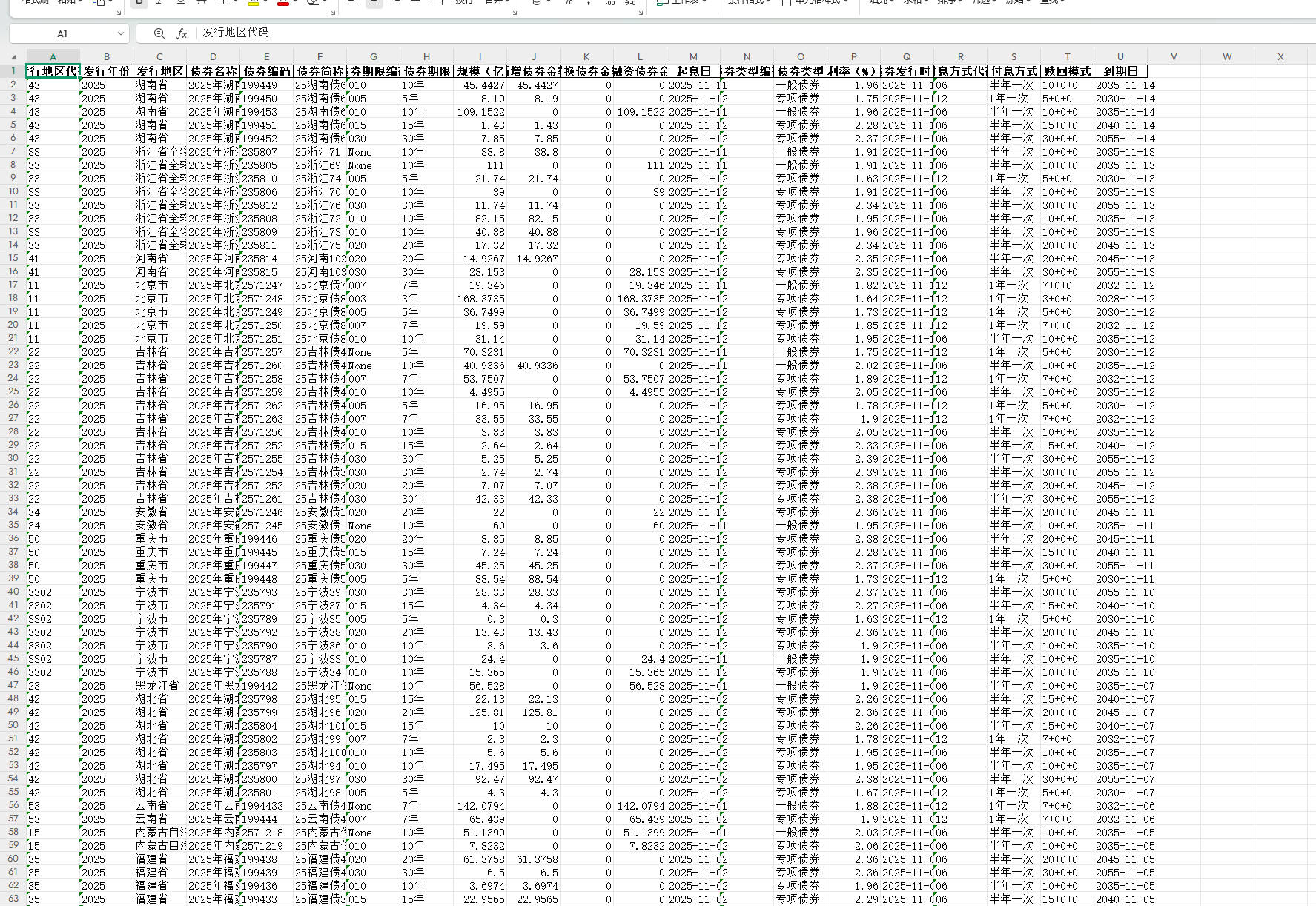 包括发行地区代码、发行地区、发行年份、债券名称、债券编码、债券简称、债券期限编码、债券期限、发行规模(亿元)、新增债券金额、置换债券金额、再融资债券金额、起息日、债券类型编码、债券类型、利率(%)、债券发行时间、付息方式代码、付息方式、赎回模式、到期日。