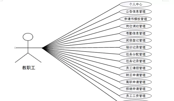 - 教职工进入系统后,可以对个人中心、公告信息管理、申请书模板管理、岗位调动管理、考勤信息管理、奖惩记录管理、培训记录管理、任务分配管理、任务记录管理、员工请假管理、转正申请管理、离职申请管理、报销申请管理、员工工资管理、员工绩效管理等功能进行操作,用例分析见图3-3。