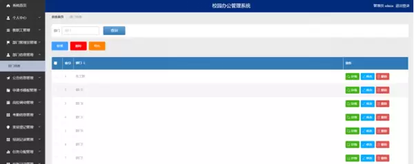 管理员点击部门信息管理。在部门信息界面输入部门信息进行搜索、导出、添加或删除部门信息列表,并根据需求对部门详细信息进行查看、编辑或删除操作;如图5-6所示: