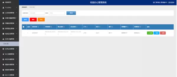 部门管理员点击任务分配管理。在任务分配界面输入任务名称和姓名进行搜索、导出、添加或删除任务分配列表,并根据需求对任务分配详细信息进行查看、编辑或删除操作;如图5-14所示:
