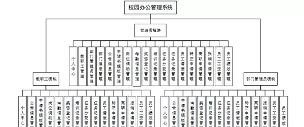 系统的构建旨在为校园办公管理提供支持,通过针对基础信息管理的特定安排,可以根据用户的权限使不同的用户角色看到不同的信息界面。基于需求分析阶段的结果,我们大致确定了系统需要包含的功能,如下图所示:
