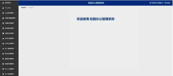 管理员进入主界面,主要职责包括对个人中心、教职工管理、部门管理员管理、部门信息管理、公告信息管理、申请书模板管理、岗位调动管理、考勤信息管理、奖惩登记管理、培训记录管理、任务分配管理、任务记录管理、员工请假管理、转正申请管理、离职申请管理、报销申请管理、员工工资管理、员工绩效管理等进行操作。管理员主界面如图5-3所示: