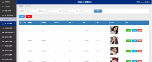 管理员点击教职工管理。在教职工界面输入教职工信息进行搜索、导出、添加或删除教职工列表,并根据需求对教职工详细信息进行查看、编辑或删除操作;如图5-4所示: