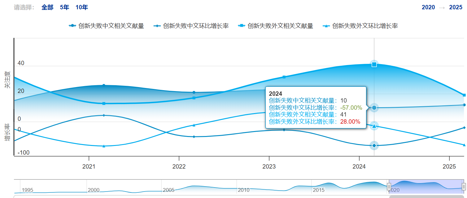 首先,我们收集并整理了从1990到2025年的A股上市公司的数据,数据主要包含公司全称,行业名称等,然后再用CNPD数据库中的专利数据按申请人名称与上市公司表中的公司全称进行匹配,再根据文献中定义的企业创新失败变量:企业年度专利申请数(创新绩效)低于行业前一年中位数(行业创新预期目标);连续失败时长:0 = 无失败,1=1 年失败,2=2 年连续失败,依此类推。