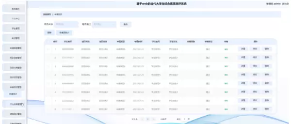 管理员点击申请测评管理:在申请测评管理页面中对学生编号、项目名称、项目分类、申请类型、申请时间、学生账号、学生姓名、审核回复、审核状态、审核等内容,进行查询或删除申请测评等操作,如图4-13所示。