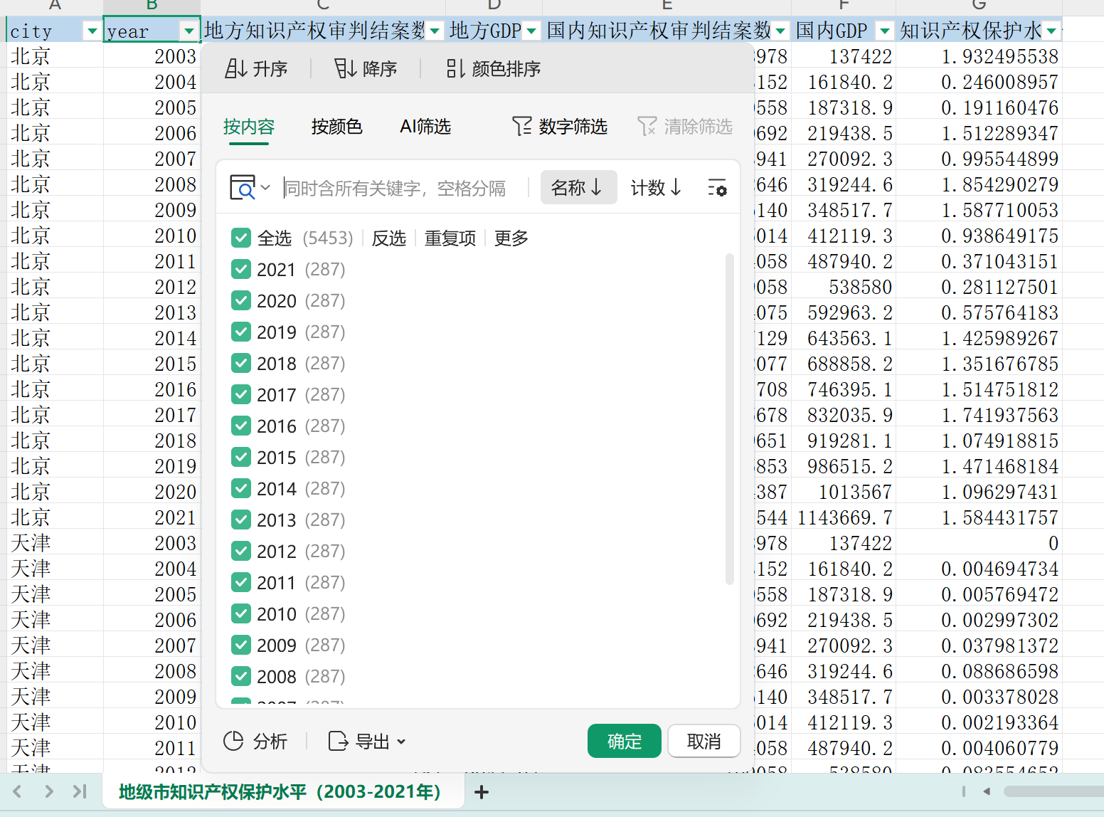 根据2000-2022年全国287个地级市知识产权司法保护数据以据此测算的2003-2021年287个地级市知识产权保护水平。缺失数据值为该年该市未有北大法宝收录案例,作零值处理。