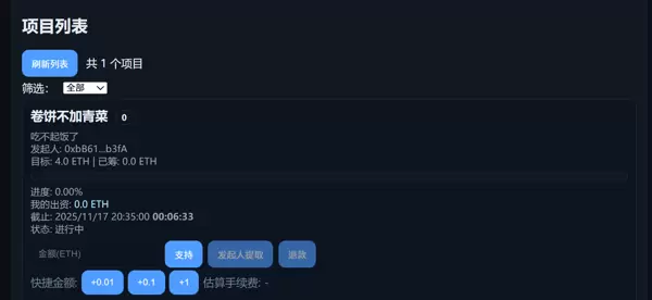 出资后页面未更新:事件监听会自动刷新,偶尔因网络原因可手动点击“刷新列表”。