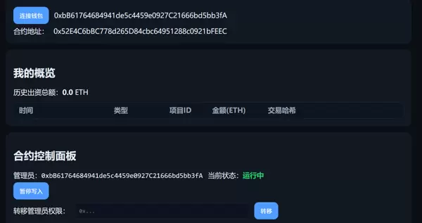 交易历史表格:展示出资、退款、提取记录,包含时间、类型、项目ID、金额、交易哈希(带区块浏览器链接)