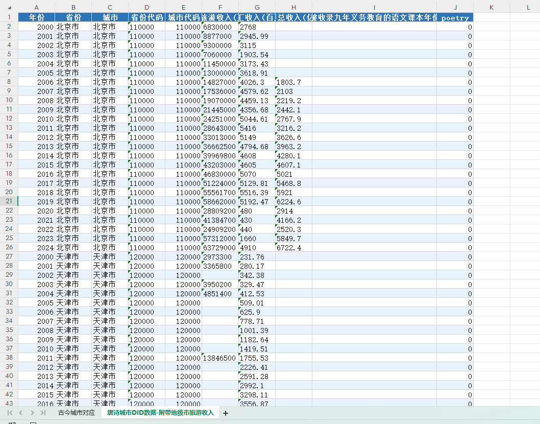 构造的“poetry”变量的定义如下:若城市i出现在《唐诗三百首》的任意诗作中,且该诗在年份t被收录至九年义务教育语文教材,则从年份t开始,城市i的“poetry”变量取值为1;若城市i未被唐诗提及,或诗作在年份i未被收录教材,则“poetry”取值为0。数据覆盖全国320个地级市(含直辖市),时间跨度为2000年至2024年。通过这一变量,可清晰识别传统文化传播对城市发展的动态影响,适用于事件研究法等实证分析。此外本数据还附带地级市旅游收入统计数据,可供大家研究使用。