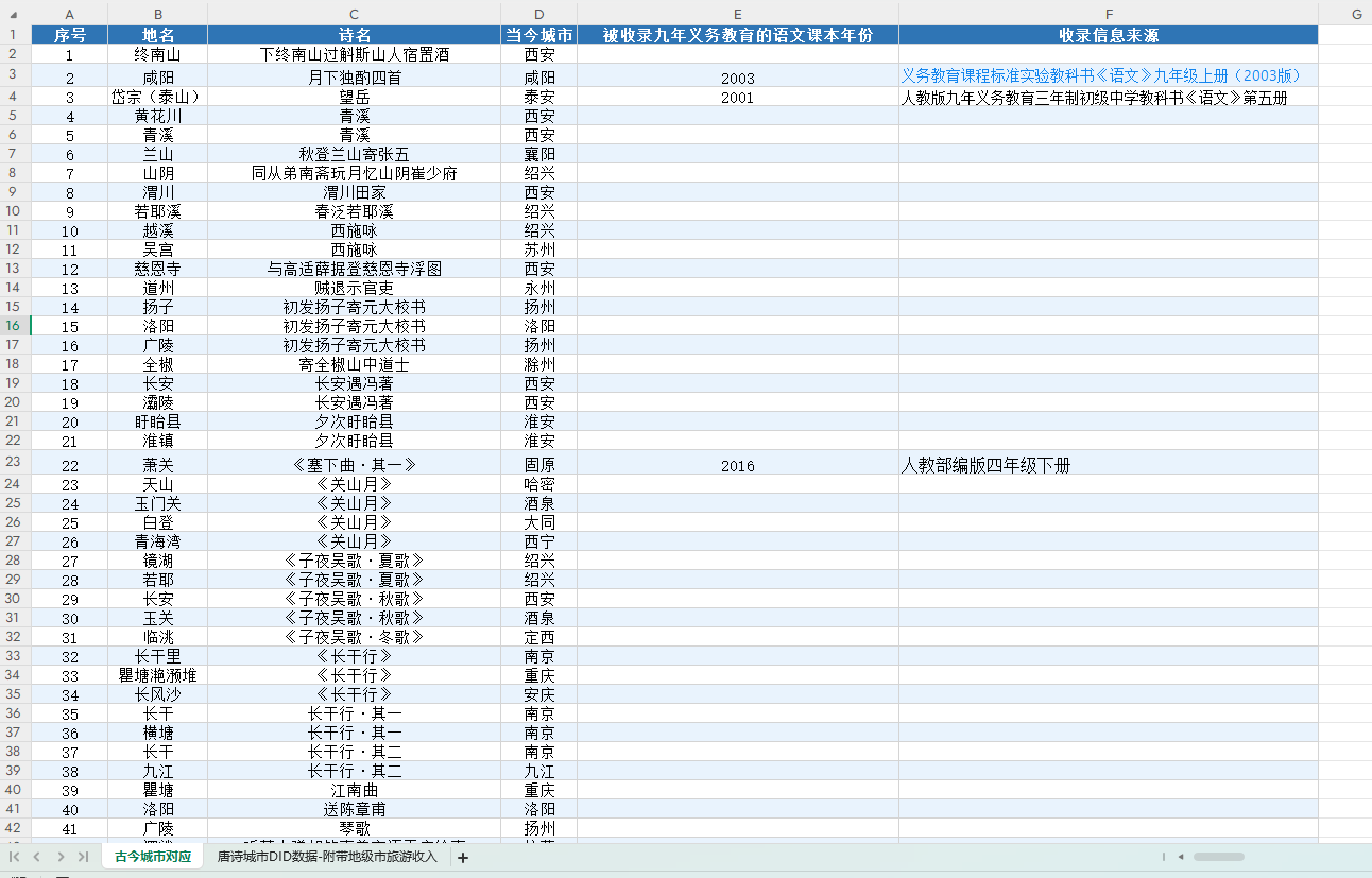 数据简介:本数据旨在量化中国各地级市在传统文化传播(以唐诗为代表)方面的政策冲击。唐诗作为中华文化的瑰宝,其通过义务教育教材的传播不仅具有文化传承意义,还可能对现代经济与社会发展(如旅游业、文化消费等)产生深远影响。本研究基于《唐诗三百首》的文本分析及语文教材收录信息,构建了城市层面的唐诗传播虚拟变量“poetry”。该变量的核心逻辑是:若某城市因《唐诗三百首》中的诗作被收录至九年义务教育语文教材而获得文化曝光,则从诗作入选年份起,该城市被视为受到传统文化传播的“文化冲击”。