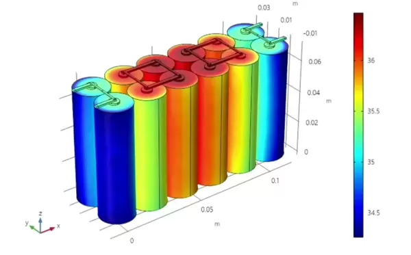 然而,电芯之间还存在冷却风道,气流和温度场相互影响。这时需要使用流固耦合(FSI)。例如,可以通过“非等温流”接口耦合流体传热和固体导热,再利用“固体力学”接口计算电芯膨胀对风道截面积的影响。
