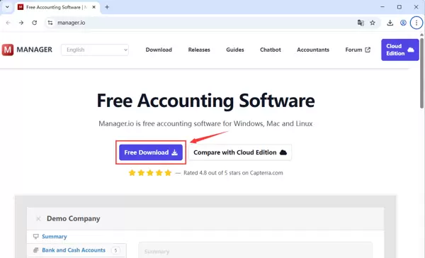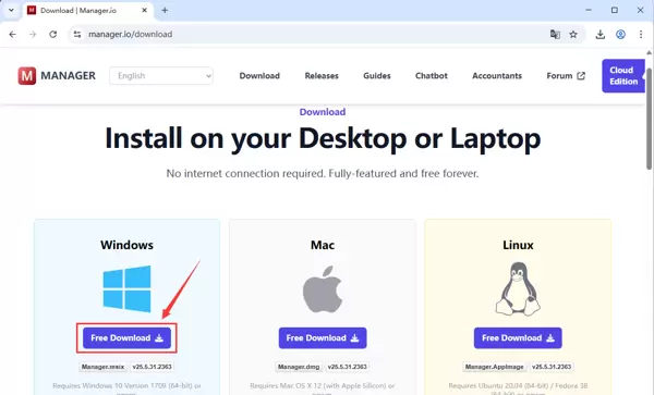 - 本教程基于 Windows 11 系统。首先,请访问 Manager 的官方网站:https://www.manager.io,找到适用于 Windows 的桌面版本,下载最新版的安装包。