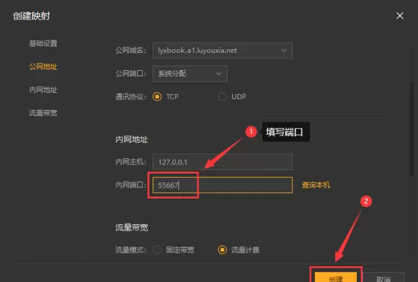 - 在“内网端口”字段中输入 Manager 的端口号 55667,然后点击【创建】按钮,如下图所示。
