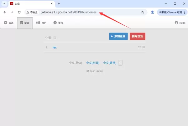 - 在外网计算机上,打开浏览器并在地址栏中输入从路由侠获取的公网地址,即可访问内网中部署的 Manager 登录界面。