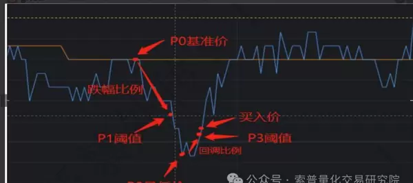 利用基准价格p0与跌幅比率来确定下跌阈值价格p1,当当前市场价格跌破p1时,使用市场触及此价格后的最低价格p2与回调比率来计算回调阈值价格p3。如果市场价进一步跌破p3,且p3小于p1,则应以(定价策略 + 价格偏差*最小价格差距)下单购买。最低价解释:一旦下跌比率阈值p1达成,系统将开始追踪并记录最低价p2,该价格会随着市场动态实时调整,p2代表从p1达成时刻起至当前时段内的最低市场价。