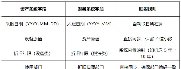 - 需求梳理:明确“同步什么、怎么同步”。首先确定需要同步的核心数据,如“资产建档、折旧、处置”等高频数据,然后逐步扩展到“维修费用、备件消耗”等低频数据。同时,明确同步规则,如“实时同步(资产变动)、定时同步(折旧数据每日凌晨同步)”。例如,某电子厂在梳理后决定优先同步“固定资产建档、折旧、报废”数据,同步频率设定为“变动实时、折旧每日一次”。