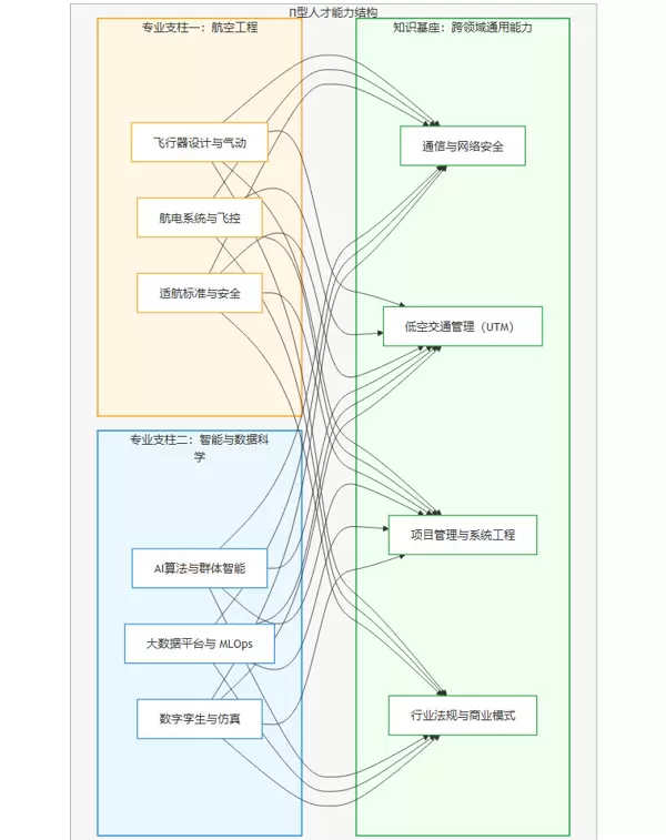 此模型清晰地展示了,未来的核心人才必须在航空工程和智能科学两个领域都具备深厚的专业知识,并在此基础上,构建涵盖通信、管理、法规等领域的宽广知识基座。