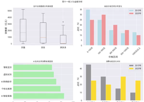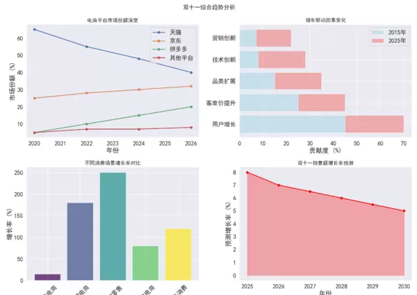 为全面展示双十一购物节的演变趋势,以下图表从平台格局、驱动因素、消费者满意度及消费动机四个维度进行系统分析。