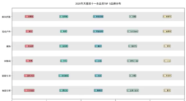 以下图表展示了2025年天猫双十一各主要品类TOP 5品牌的分布情况: