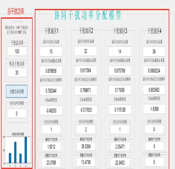 针对各扇区的干扰需求,模型综合考量威胁等级、压制成功率及目标函数变化量等因素,进行科学合理的功率分配。