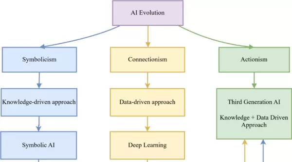 综述首先将生成式 AI 置于人工智能发展的长河中加以审视。作者通过一张整合符号主义(symbolicism)、连接主义(connectionism)与行动主义(actionism)的示意图,揭示 AI 思想流派的演变轨迹。早期 AI 以符号操作和逻辑推理为核心,典型代表包括专家系统和规则引擎;随后,神经网络与深度学习的兴起使连接主义复兴,推动数据驱动的表示学习成为主流;近年来,具身智能、交互式学习与机器人技术所体现的行动主义,则强调“感知—行动—反馈”的闭环机制。
