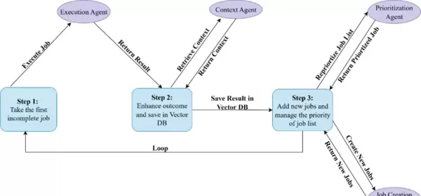 以 BabyAGI 为例,其工作模式可抽象为一个动态更新的任务队列机制:从待办列表中提取优先级最高的任务,借助 LLM 生成具体操作步骤,调用相应工具完成执行,并将结果反馈至记忆系统与任务池,从而形成持续演化的自治循环。