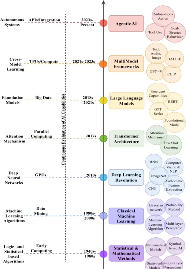 生成式 AI 正是在连接主义与行动主义交汇处成长起来的技术集合。不同于判别模型仅用于分类或预测,生成式模型致力于学习数据本身的分布规律,从而能够在给定条件下创造出符合统计特性的新样本。研究通过一条时间轴展示了从1940年代至今的技术演进路径:从早期基于规则的符号生成系统,发展至概率图模型驱动的生成方法,最终演变为 GAN、变分自编码器(VAE)、自回归模型、扩散模型、Transformer 架构以及大规模基础模型(foundation models)等现代技术形态。