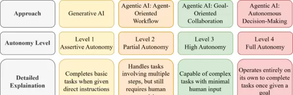 | 行为自治程度 | 被动应答,依赖外部调用 | 在任务范围内具备一定自治 | 能在给定目标下主动生成子任务并执行,具备较强自治 | 在系统级目标下,各智能体可自主协作或博弈,自治程度更高 |