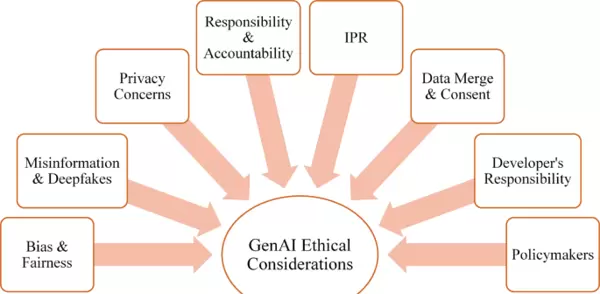 该图的关键价值在于对“风险”“伦理”与“监管”三类概念进行了清晰划分:隐私与安全聚焦于个体与系统的直接威胁;公平与偏见关注算法输出对不同社会群体的差异化影响;透明性与可解释性则强调决策过程是否可追溯;虚假信息与操纵涉及公共舆论与民主机制的稳定性;版权与知识产权问题围绕训练数据来源与生成内容所有权展开;而监管与合规则是制度层面对上述问题的回应机制。