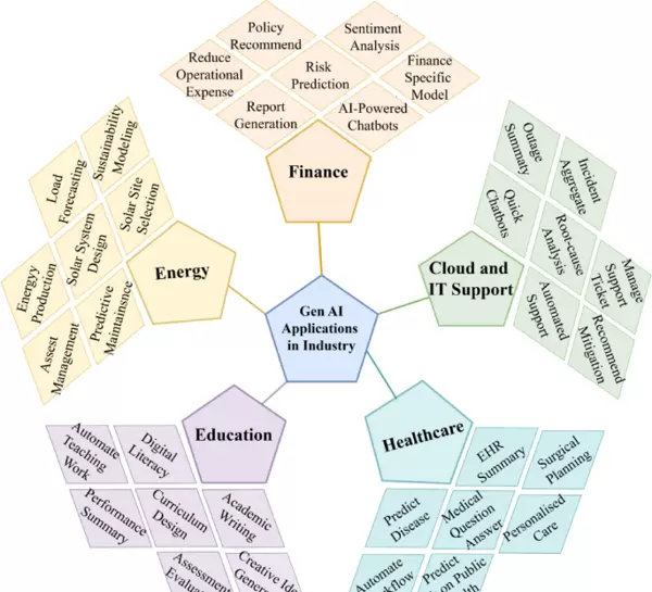 在行业应用方面,该研究并未停留于简单罗列应用场景,而是采用结构化分析方法,深入探讨生成式 AI 在金融、云服务与信息技术、医疗健康、教育及能源等关键领域的基础性影响。尤为值得注意的是,文中提出的“工业 GenAI”概念,为理解生成式 AI 在产业环境中的角色提供了具有理论潜力的分类视角。