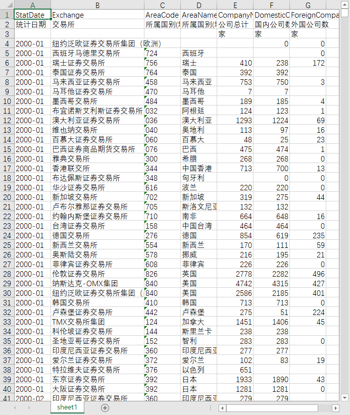 统计日期 交易所 所属国别(地区)代码 所属国别(地区)名称 公司总计 国内公司数 外国公司数