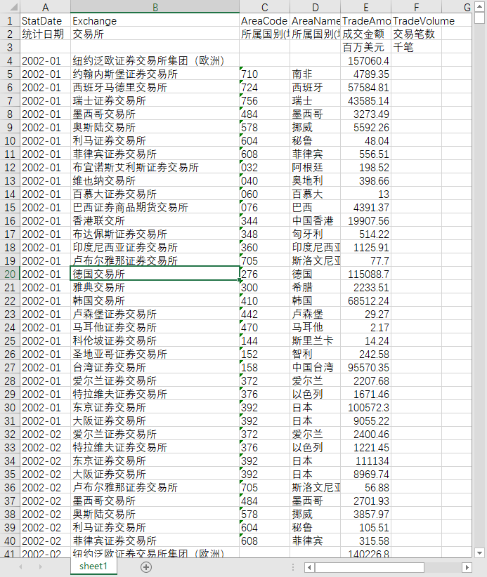 统计日期 交易所 单位 所属国别(地区)代码 所属国别(地区)名称 市值