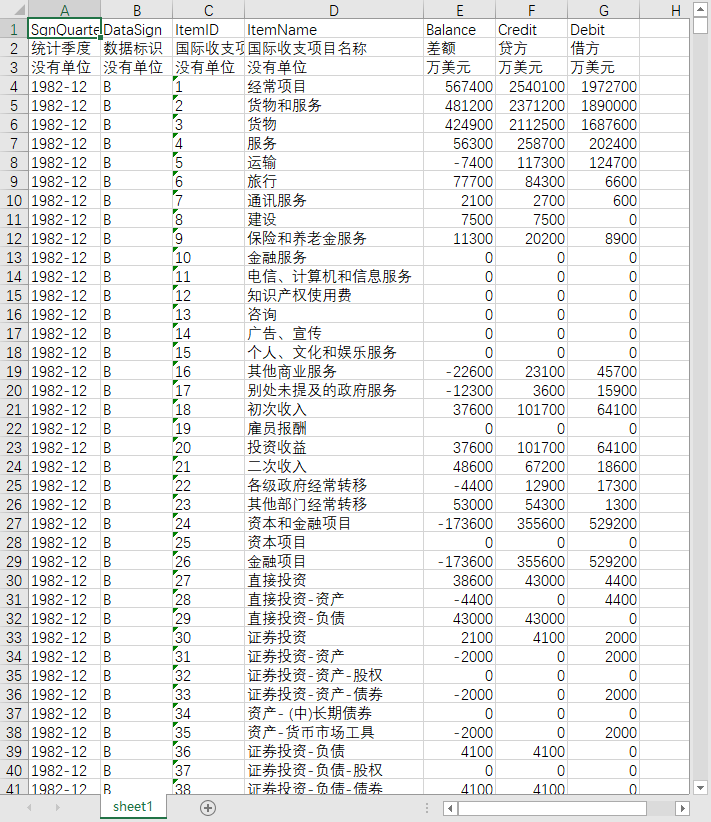 统计季度 数据标识 国际收支项目编码 国际收支项目名称 差额 贷方 借方
