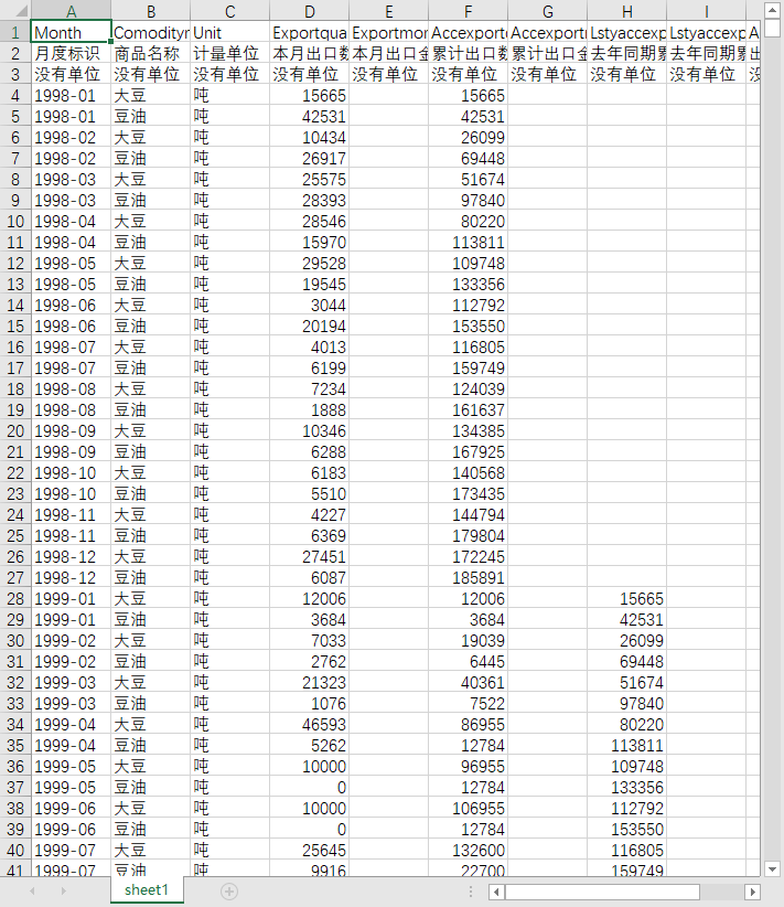 月度标识 商品名称 计量单位 本月出口数量 本月出口金额 累计出口数量 累计出口金额 去年同期累计出口数量 去年同期累计出口金额 出口数量累计比去年同期增减 出口金额累计比去年同期增减