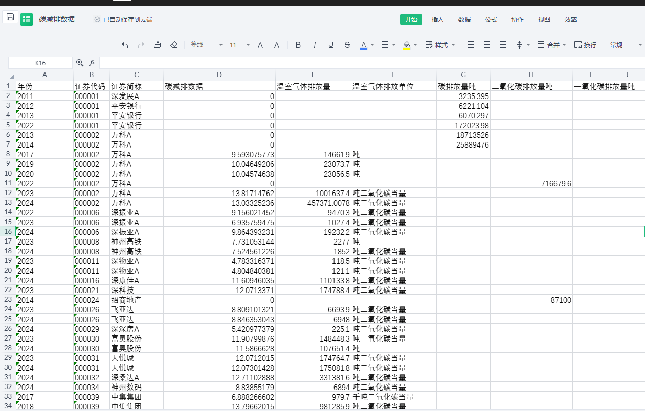 年份 | 证券代码 | 证券简称 | 碳减排数据 | 温室气体排放量 | 温室气体排放单位 | 碳排放量吨 | 二氧化碳排放量吨 | 一氧化碳排放量吨 |