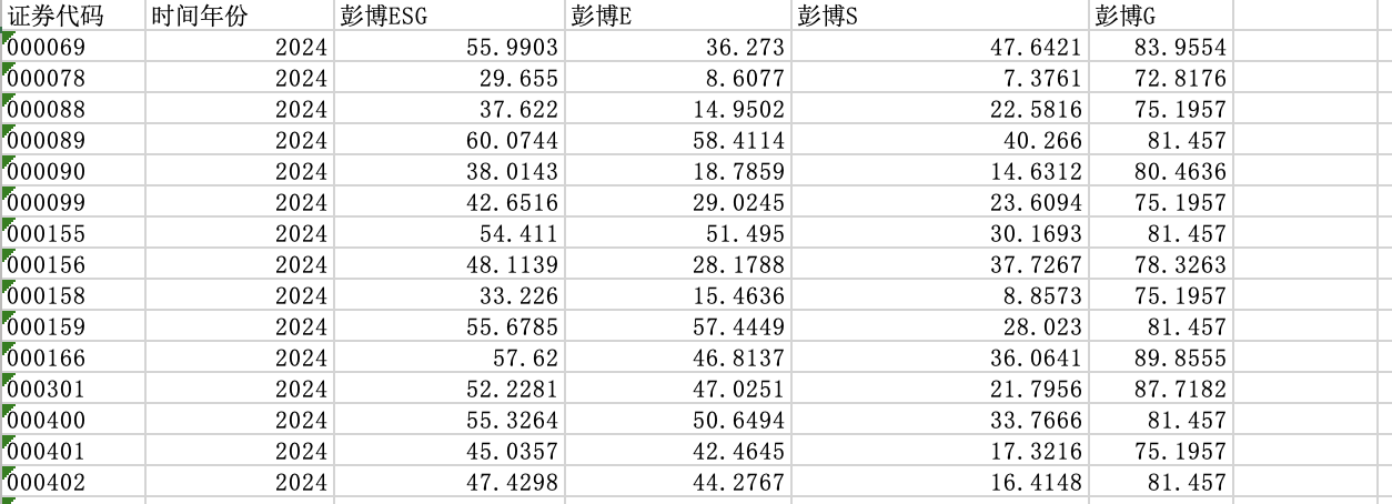2.数据范围:包括计算方式、综合得分、分项得分数据,具体指标为 证券代码、year 、ESG、 E、S、G