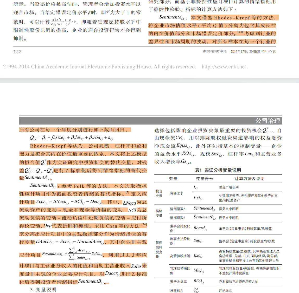 张庆, 朱迪星. 投资者情绪、管理层持股与企业实际投资——来自中国上市公司的经验证据[J]. 南开管理评论, 2014, 017(004):120-127,139.