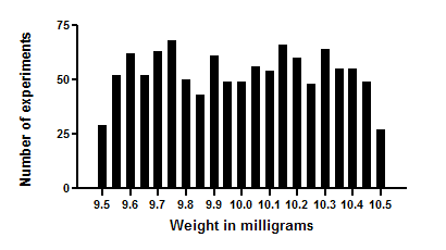 想象一个非常简单的“实验”:您用移液管移取一些水并称重。移液管本应移取10微升水,但实际移取量会随机波动在9.5到10.5微升之间。如果您移取1000次,并将结果绘制成频率分布直方图,它会呈现出下图的样子。