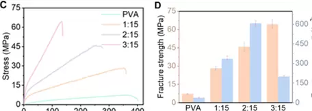 更值得一提的是,该凝胶的力学性能具有可调性。通过调节硬相材料芳纶纳米纤维(ANF)与软相材料聚乙烯醇(PVA)的比例,可以灵活控制其强度与柔韧性。例如,当ANF与PVA的质量比为3:15时,凝胶的断裂强度达到峰值,同时仍保有良好的折叠与扭转能力。