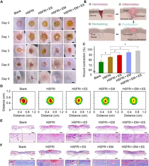 团队还在大鼠感染伤口模型中对该材料组合进行了验证。结果显示,采用“HSFRI + 红霉素 + 电刺激”协同治疗的伤口,在9天内的收缩率达到96.84%,显著高于空白对照组的75.74%。组织切片分析进一步证实,治疗组伤口区域出现了更多的毛囊与皮脂腺再生,胶原蛋白沉积也更为密集——说明该方案显著加速了组织修复进程,相当于为伤口愈合按下了“快进键”。