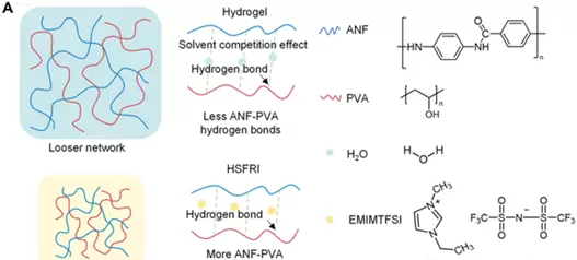 传统水凝胶的问题源于“溶剂竞争”——水分子会与聚合物链争夺氢键结合位点,削弱ANF(硬相)与PVA(软相)之间的连接,导致结构松散、易断裂。