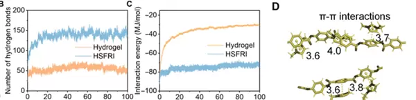 分子动力学模拟结果证实:在HSFRI中,ANF与PVA之间的氢键数量是传统水凝胶的3倍。此外,EMIMTFSI还能通过静电作用和π-π堆积进一步增强材料间的结合力,在确保结构稳定性的同时保留足够的液态组分,使凝胶兼具刚性与柔韧。