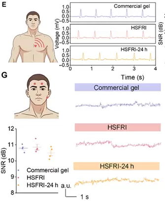 基于这些优势,研究团队将HSFRI用于制备可穿戴电极——通过在其内部原位聚合聚吡咯(PPy),获得高精度生物传感器。实验证明,该电极可稳定采集心电图(ECG)、肌电图(EMG)和脑电图(EEG),信噪比与商用标准电极相当。
