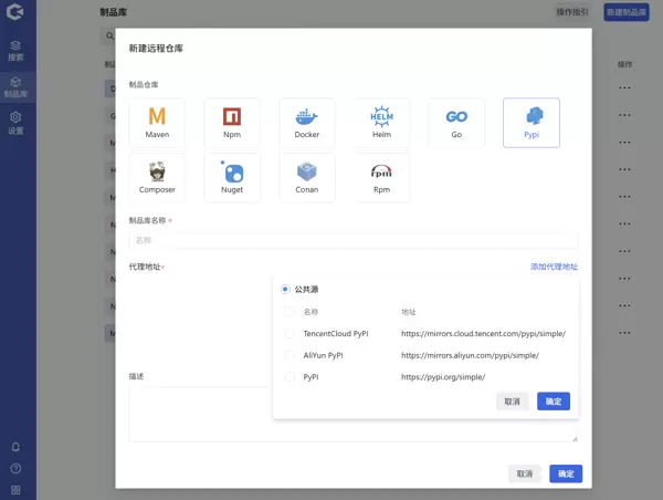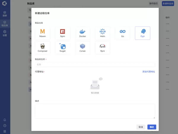 在“新建制品库”界面中选择“远程库”,填写相关信息并确认提交。