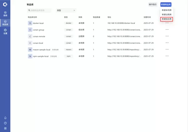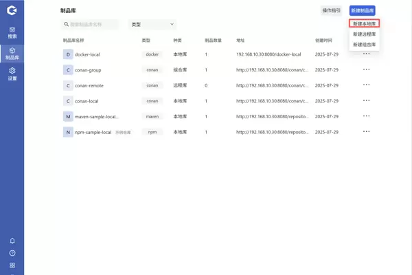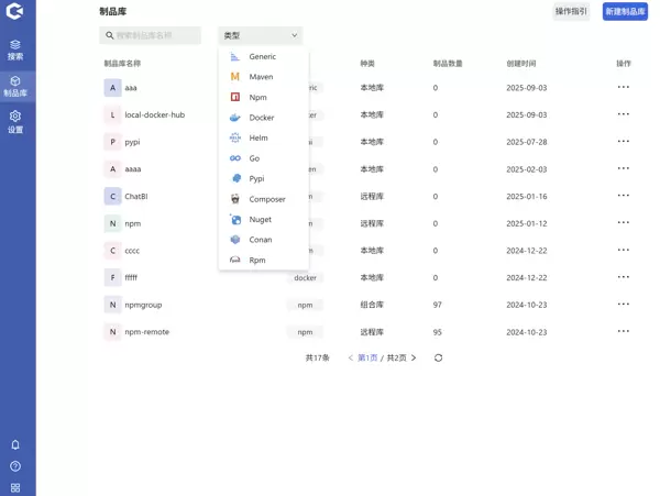 登录 Hadess 后,进入制品库管理页面。可通过顶部的制品类型筛选器进行分类查找,也可直接在搜索框中输入制品库名称进行快速检索。