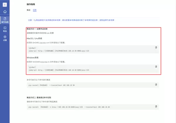 在制品库界面点击“操作指引”,选择 Pypi,复制生成的配置内容。Windows 用户需将其添加到 %HOME%/pip/pip.ini 文件中;MacOS 或 Linux 用户则应写入 $HOME/.pip/pip.conf 文件。