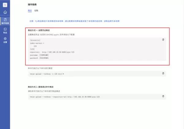 进入目标制品库页面,点击右上角“操作指引”,选择 Python 类型,获取配置指引文本,并将其写入用户主目录下的 $HOME/.pypirc 文件中。
