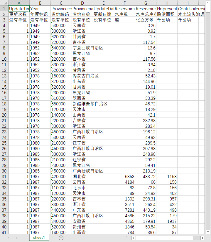 更新次数 年度标识 省份编码 省份名称 更新日期 水库数 水库总库容量 除涝面积 水土流失治理面积