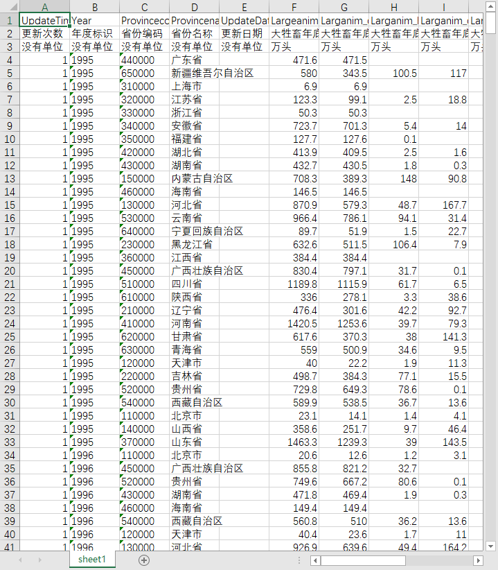 更新次数 年度标识 省份编码 省份名称 更新日期 大牲畜年底头数总计 大牲畜年底头数-牛 大牲畜年底头数-马 大牲畜年底头数-驴 大牲畜年底头数-骡 大牲畜年底头数-骆驼 肉猪出栏头数 猪年底头数 羊年底只数 羊年底只数-山羊 羊年底只数-绵羊